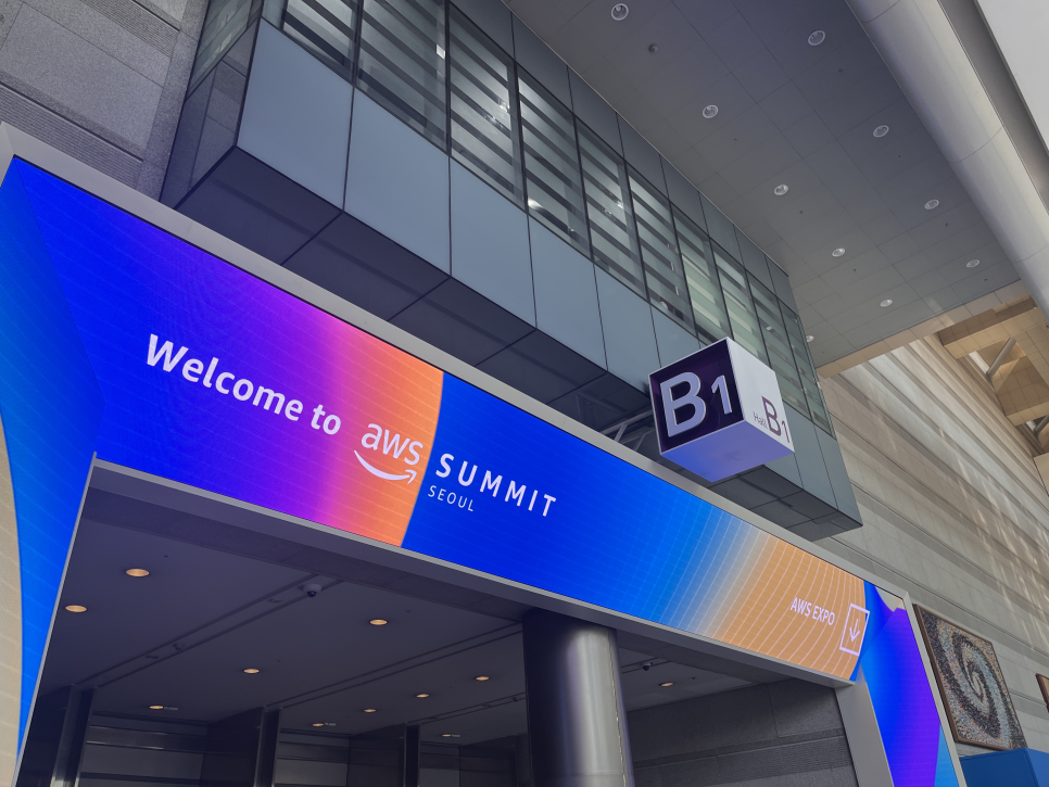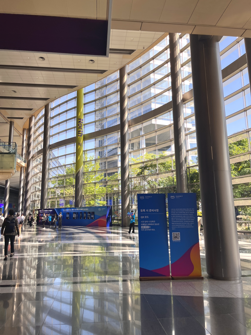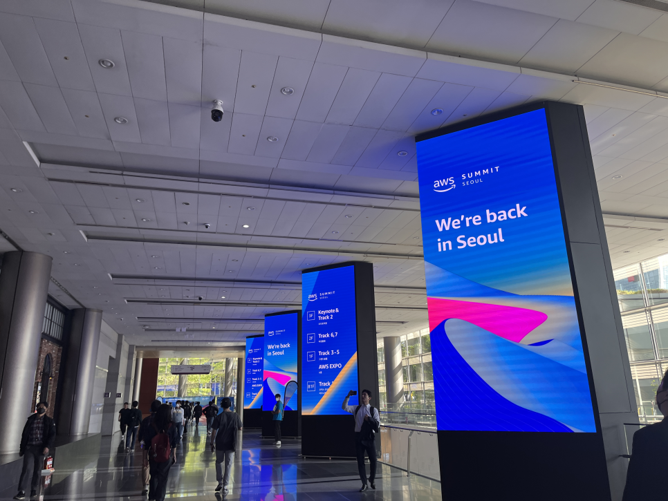 AWS 서밋이 진행되었던 코엑스 B홀 입구의 모습이에요. 이번 행사는 엔데믹을 기념하여 밝은 톤으로 구성되었다고 해요.
