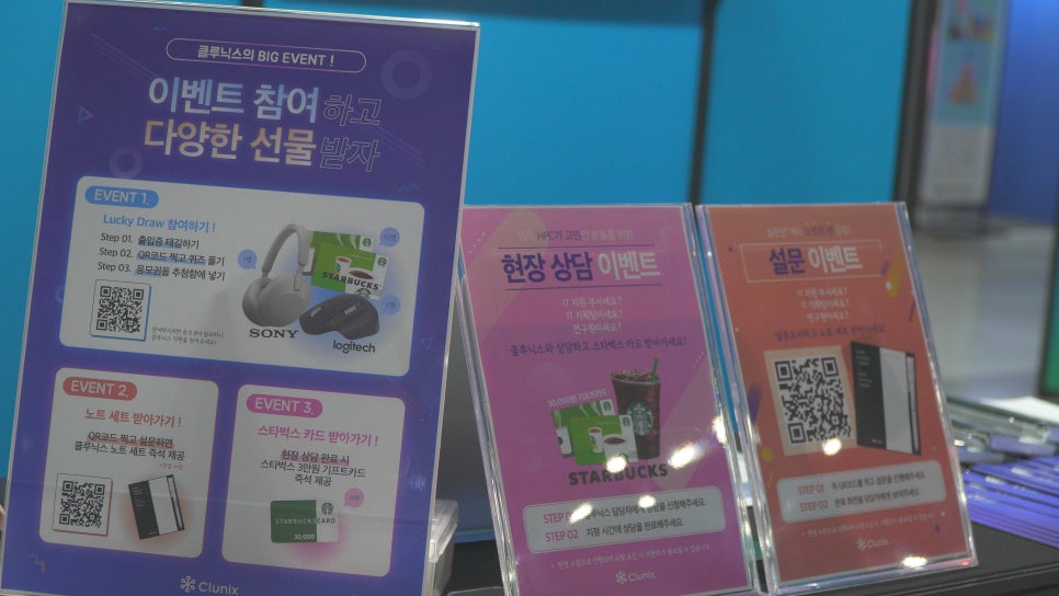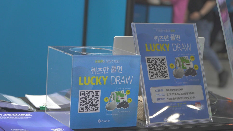 클루닉스 부스에서는 무려 4가지의 이벤트가 진행되고 있었습니다. 가장 많은 호응을 이끌었던 클루닉스의 럭키드로우!🎁 아렌티어에 관한 간단한 퀴즈를 풀면 무려 소니 헤드셋과 로지컬 MX Master 3s, 스타벅스 기프트카드를 받을 수 있는 기회가 주어졌어요.