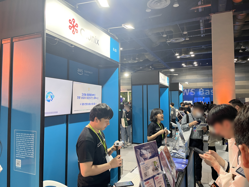 AWS 서밋에는 약 60개의 관계사가 참여하여 부스를 운영했습니다. 그런데 HPC(High Performance Computing; 고성능컴퓨팅)에 관한 부스는 저희 클루닉스 하나였다는 것! 그래서인지 최근 인공지능과 기술의 발달로 인해 중요성이 더욱 부각되고 있는 HPC에 관심이 있으신 분들이, 클루닉스에 와서 HPC에 관한 궁금증을 많이 해소하고 가셨습니다.