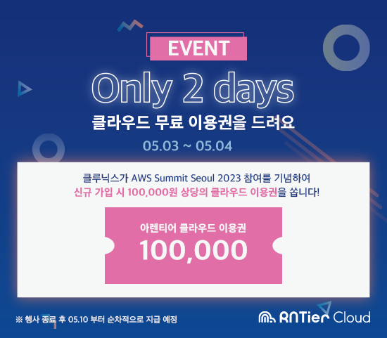 AWS Summit Seoul 2023이 열리는 5월 3일 ~ 4일 단 이틀 간, 아렌티어 클라우드 홈페이지에 가입하시면 10만원의 무료 이용권을 지급해드려요!