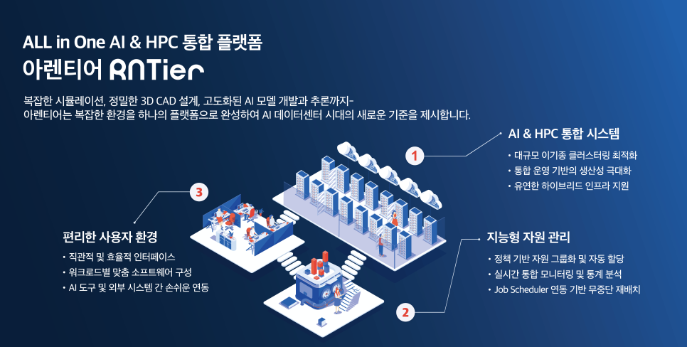 아렌티어를 통해 인프라 클러스터링부터 자원 관리, 편리한 사용까지! 복잡한 환경을 하나의 플랫폼으로 제공하여 AI 데이터센터 시대의 혁신을 경험할 수 있어요.