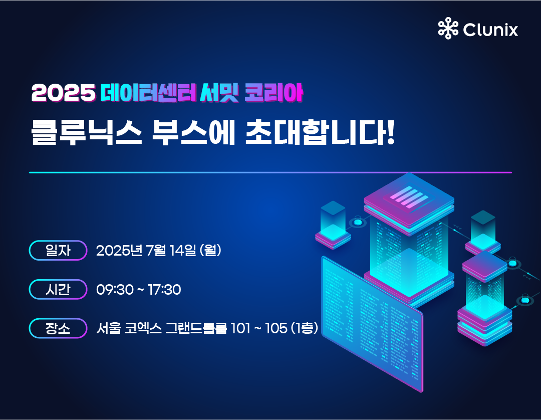 안녕하세요. 클루닉스입니다. 다가오는 7월 14일, 서울 코엑스에서 개최되는 데이터센터 서밋 2025에 클루닉스가 발표 및 전시부스로 참가합니다.
