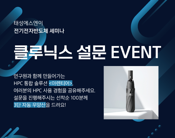 클루닉스 부스에서 진행하는 설문 이벤트로 여러분의 HPC 사용 경험을 공유해주시면 준비한 기념품과 함께 HPC 통합 솔루션 아렌티어에 대한 자세한 안내 도와드리겠습니다.