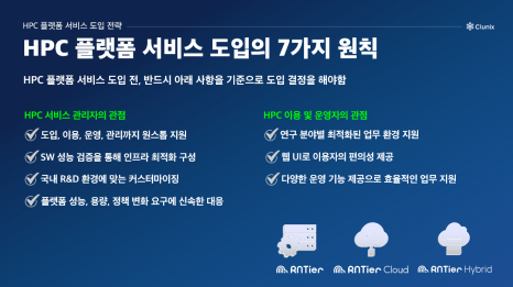 그래서 이날 클루닉스는 공공과학기술 분야에서의 HPC 이슈와 HPC 플랫폼 서비스를 성공적으로 도입하기 위한 7가지 원칙을 소개했습니다.