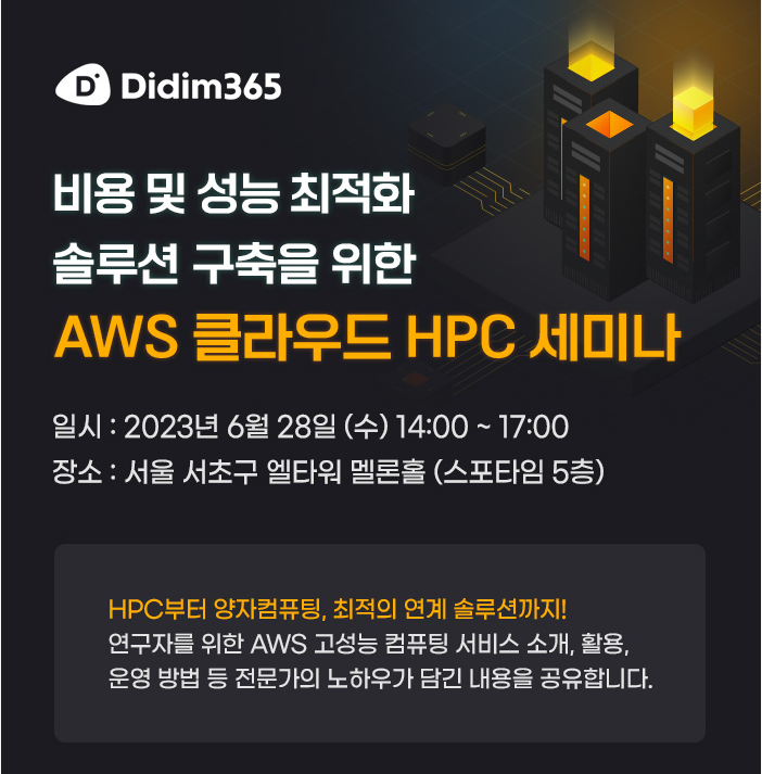 디딤365가 개최한 AWS 클라우드 HPC 세미나가 지난 28일 수요일에 진행되었고, 클루닉스가 발표로 참가하였습니다.