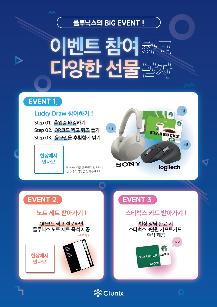 클루닉스가 제공하는 첫 번쨰 이벤트는 바로, Lucky Draw 참여예요! 부스에 오셔서 출입증을 태깅하신 후, QR 코드를 찍고 아주아주 간단한 퀴즈🔍만 풀면, 소니 WH-1000XM5 헤드셋과 로지텍 MX Master 3s 마우스, 스타벅스 2만원 기프트카드까지! 다양한 선물에 응모🎁할 수 있어요.