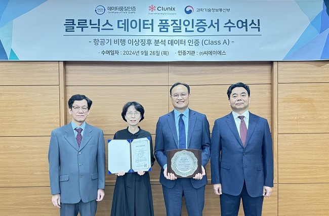 클루닉스는 최근 항공우주산학융합원이 주관한 '빅데이터 기반 항공안전관리 기술개발 및 플랫폼 구축' 연구개발에 함께 하였고, 해당 연구의 산출물인 '항공기 비행 이상징후 분석 데이터'에 데이터 품질 인증의 최고 등급인 Class A를 부여받았습니다.